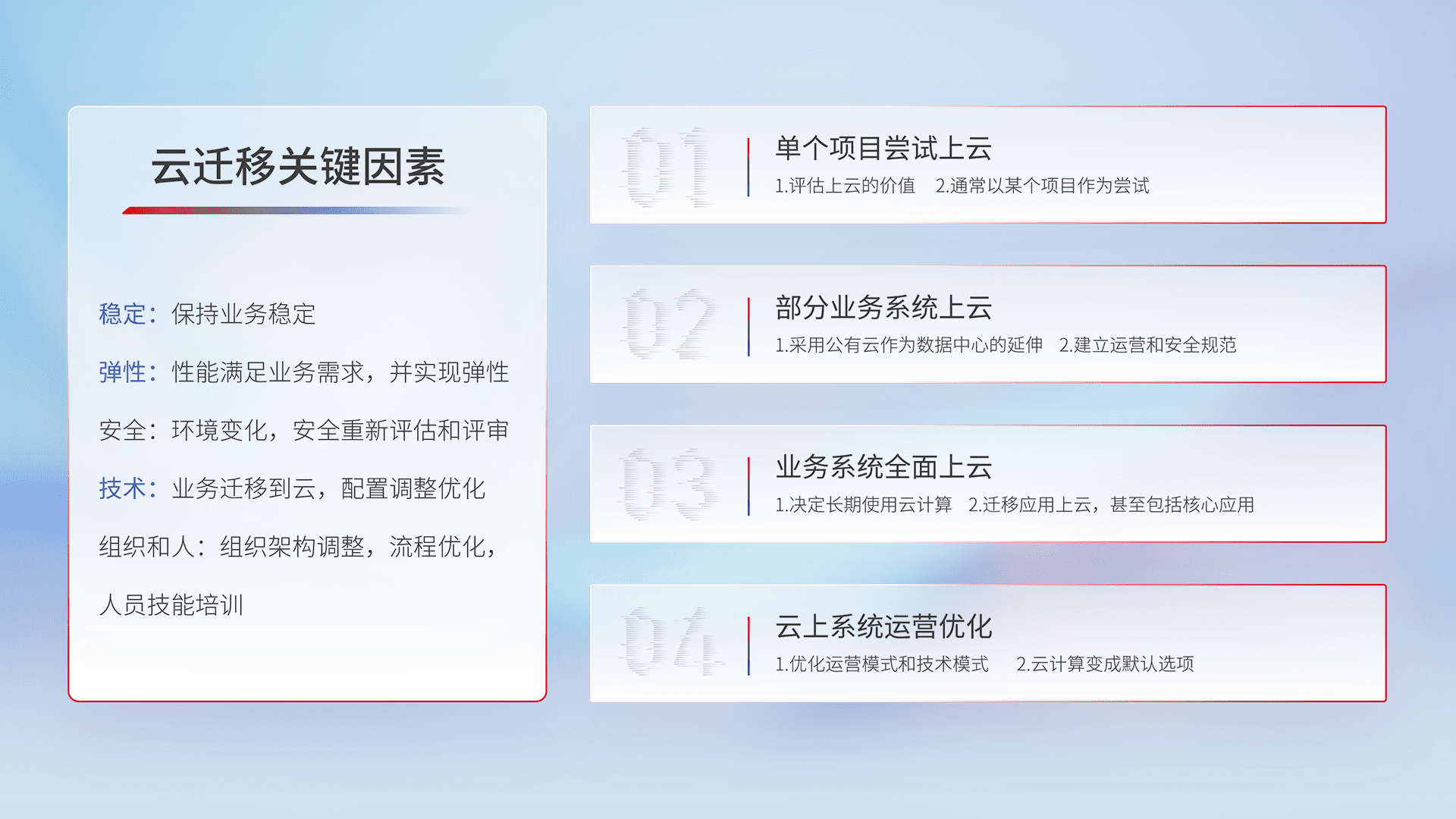 结合实际业务,,,从规划设计、、、、云平台选型、、云原生改造、、、、数据迁移、、、、集成交付,,,,迁移全过程为客户识别最佳上云路径,,,,做好风险识别管理,,,设计网络架构、、、身份权限、、安全审计合规、、操作审计、、、、日志审计、、监控告警策略、、、多站点容灾设计等,,对云上基础设施进行整体规划,,提升IT治理水平,,以满足弹性、、高可用、、高性能的需求。。