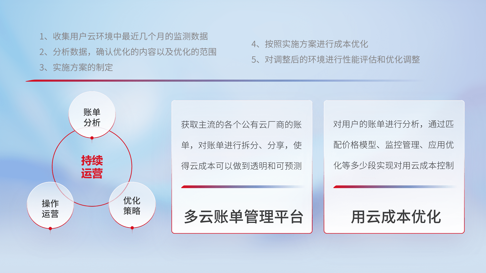 通过多云纳管,,以统一的资源数据模型把客户的云资源进行抽象和封装,,,进而实现对多云资源的统一操作,,,保障云资源管理的可靠性、、稳定性与可用性。。量身定制化运维内容,,配置、、开发运维、、补丁管理、、备份、、、监控、、、认证和访问管理、、审计和日常巡检等,,保障在用云过程中的可靠度,,,,稳定度以及高可用率。。